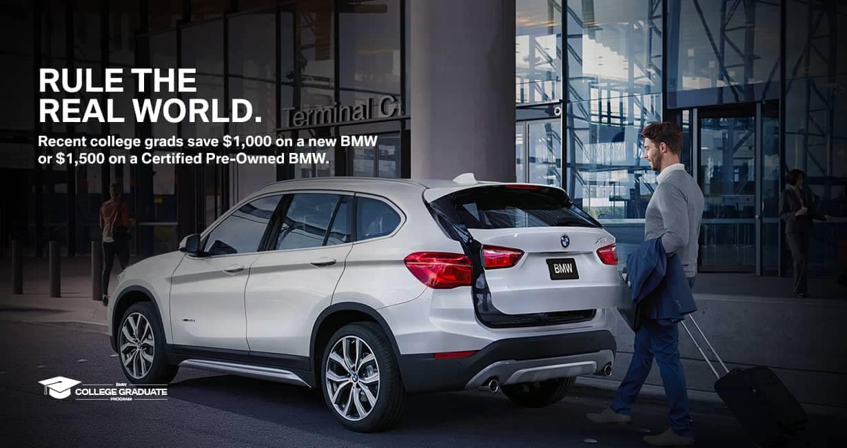 If you are a recent college graduate, you have places you want to go. Which is why BMW is giving you $1,000 off a new BMW, $1,000 off a Certified Pre-Owned BMW, and our best available rates. No matter which model you choose, you can tell the world you have arrived - for less than you think.EXCLUSIVE SAVINGS, EXCLUSIVELY FOR COLLEGE GRADS